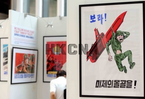 10月7日,香港一商厦展出三十多幅朝鲜手绘的政府宣传海报。右图将美军丑化。香港中通社图片