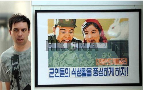 10月7日,香港一商厦展出三十多幅朝鲜手绘的政府宣传海报。图为鼓励多养些鸽子,让军人们享用更丰盛的饮食。香港中通社图片