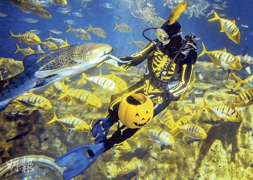 潜水员亦同水族馆内的鱼一齐过节,潜水员穿着骷髅骨装束,用大南瓜装满鱼粮下水喂鱼。