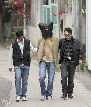 探员将疑犯以涉嫌“无牌管有枪械及藏有攻击性武器”罪名拘捕,黑布蒙头带署调查。来源:香港《明报》