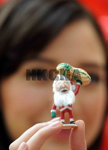 香港一商场12月9日起展出超过20件花生“名人”展品。图为“迷你”圣诞老人,与大家欢度色彩“粒粒”缤纷的圣诞节。香港中通社图片