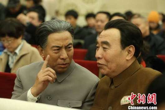 资料图:由高希希执导的百集大型史诗电视剧《毛泽东》2012年12月26日举行新闻发布会。饰演刘少奇的郭连文、饰演朱德的王伍福二人在现场交谈。