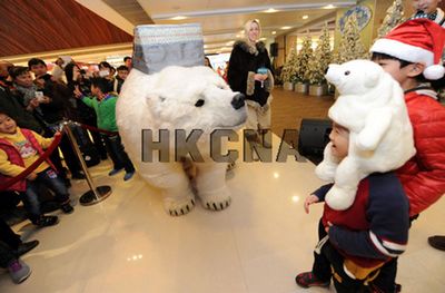 12月24日,香港一商场请来全球唯一1:1大小的机械北极熊Bjorn巡游贺圣诞,并宣扬保护北极熊。Bjorn曾参演好莱坞电影《魔幻罗盘》,它丰富的表情,精灵的眼睛深得观众喜爱。香港中通社图片