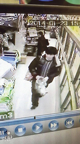 女人缠住店员 男人偷猫