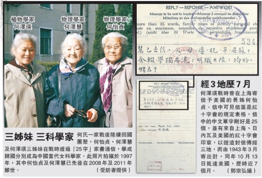 何氏三姊妹倚靠“25个字”通信的日子,直至二战以后才结束,散居各地的兄弟姊妹也陆续回国团聚;其中学成的何怡贞、何泽瑛均成为中国当代的女科学家,次女何泽慧与丈夫钱三强甚至被誉为“中国的居里夫妇”。但战乱当前,无论是科学家或平民百姓,挚亲的平安至为重要;刘深说,翻看的每封家书“都只关于平安,其他东西一概不提,钱财或房产等全不关心”。