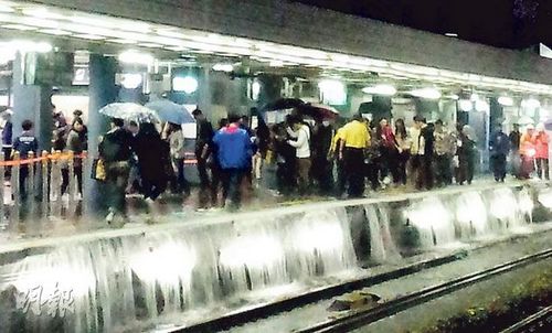 黑雨下东铁线九龙塘站顿成泽国,路轨被“淹没”,往来方向一度要单线双程行车,往来红磡至大围每12分钟一班车,大围至罗湖每8分钟一班。图片来源《明报》