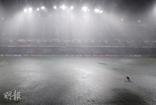 昨日国际七人榄球赛后天气转坏,红雨再黑雨,有球迷及记者因为天气一度被困香港大球场,其间记者看到一名疑似醉酒球迷走落已恍如水塘的球场中央,做出像“达阵”般的动作。图片来源《明报》