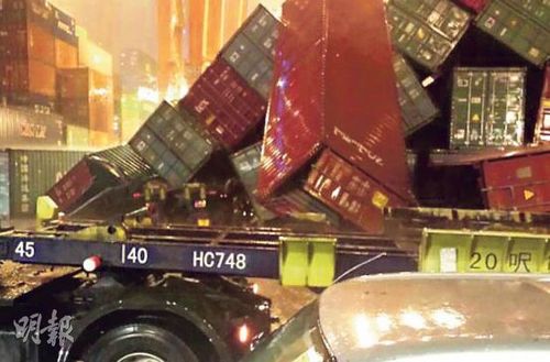 一阵大风将葵涌码头一排货柜吹跌,压中地上一部工作车,车上司机及时跳车。香港国际货柜码头发言人说,幸意外中只有一名内运车司机轻伤。图片来源《明报》