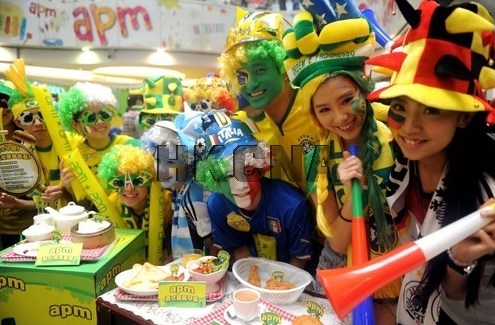 四年一度世界杯即将在巴西举行,香港apm商场为争夺世界杯带动的生意额,将全程热播64场世杯精彩赛事。5月13日,热情的球迷在记者会为活动助庆。香港中通社图片