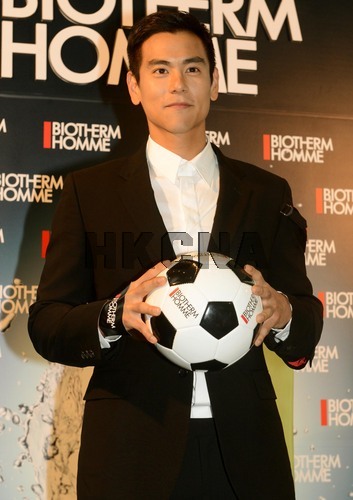 6月5日,台湾全能影视天王彭于晏在香港出席一男士护肤品牌发布会,适逢世界杯将至,化身足球教练登场展现帅气迫人,为产品造势。香港中通社图片