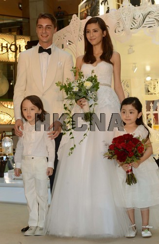 6月18日,艺人吴千语在香港出席中环一商场推广活动。图为吴千语身穿婚纱与男模演绎理想中的婚礼造型。香港中通社图片