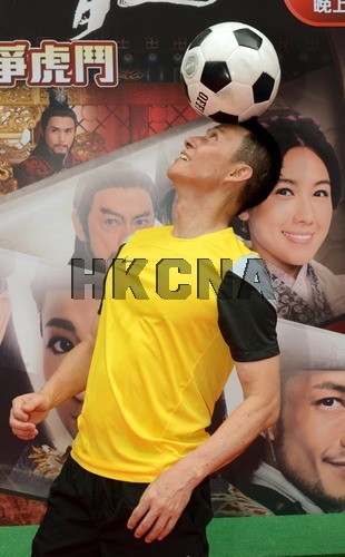 7月9日,艺人张国强在香港出席TVB古装剧《寒山潜龙》在一所中学举行宣传活动,为热播中的剧集宣传造势。图为足球员出身的张国强以头部控球,赢得一片掌声。香港中通社图片