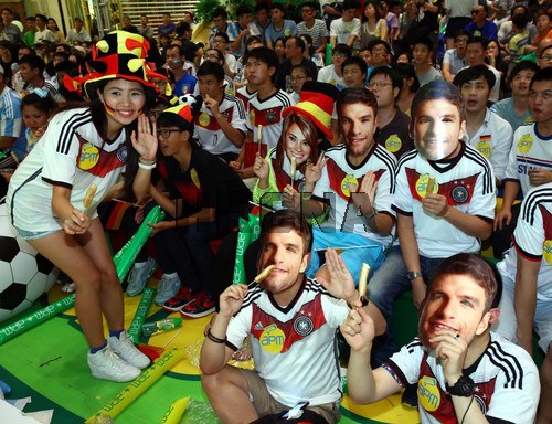 巴西世界杯决赛上演,香港多个商场均有直播赛事。7月13日晚,在观塘的apm商场举行直播派对,逼满大批通宵观看决赛的球迷,商场在赛前派发德国与阿根廷的地道小食,又与球迷玩游戏。香港中通社图片