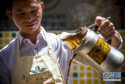 7月28日,港式奶茶师在香港铜锣湾街头展示冲调技艺。新华社记者 吕小炜 摄