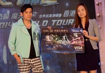 9月29日,艺人周杰伦在香港出席《魔天伦II》世界巡回演唱会香港站记者会。图为周杰伦获演唱会赞助商送上信用卡。香港中通社图片