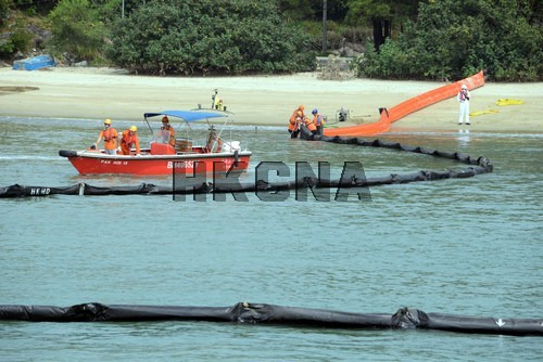 两个分别以“油演2014”及“有毒有害物质溢漏演习2014”作代号的周年海上污染事故联合演习,10月16日上午在屯门海面同时举行,测试在香港水域内发生溢油及溢漏有毒有害物质事故时的应变能力。联合演习仿真运油轮和运载化学品轮船相撞,导致液体泄漏。图为清理人员在海滩进行清理岸滩油污的演练。香港中通社图片
