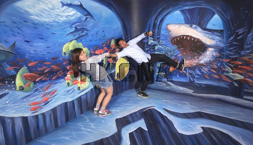 12月9日,参观者在香港浅水湾超视觉艺术馆与鲨“共舞”。该艺术馆作品均由国际化团队创作,包括韩国知名画家原创手绘的立体绘画以及数码作品,分为畅游海洋、奇幻世界、游遍香港等主题。香港中通社图片