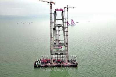 港珠澳大桥跨度最大航道桥成功吊装索塔(图)