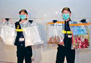海关人员展示藏毒的荔枝盒、冰毒。香港《星岛日报》图