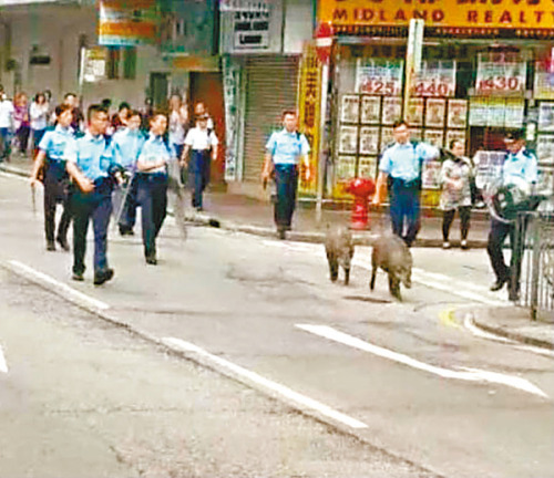 野猪兄弟游香港闹市 警员“护送”回山引市民围观