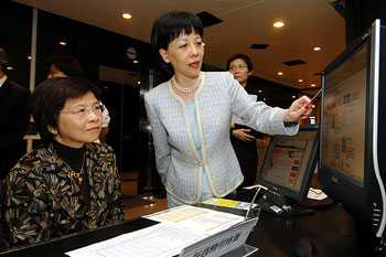 香港商务及经济发展局局长刘吴惠兰(左)访问消委会北角总办事处时,听取总干事刘燕卿介绍格价工作。(图片来源:香港特区政府网站)