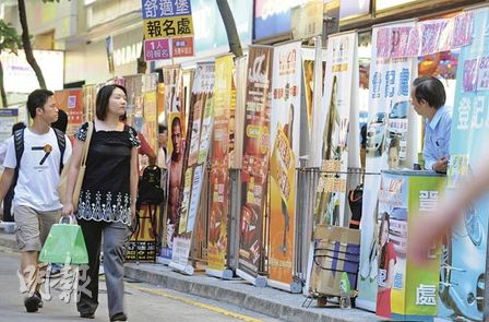 闹市街头不难发现摆满易拉架,既有楼上咖啡店的宣传品,也有不少是电讯公司推销员招揽生意的宣传工具。香港公共事业工会联合会秘书长崔世昌表示,食环署严打易拉架,对电讯推销员影响甚大,这些员工并不直接隶属于电讯公司,而是由承接电讯公司生意的判头商以自雇形式聘请,他们一旦被检控,就要自己“背上身”。