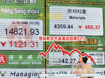 十月十日,香港恒生指数收市报一万四千七百九十六点八七(14796.87),下挫一千一百四十六点三七(1146.37)。港股累计一周下跌二千八百八十六点,跌幅达一成六。 中新社发 邓庆乐 摄