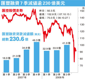 另外,受到信贷紧缩和资产价格下跌影响,汇控的投资银行部门“环球银行及资本市场”所持有的资产抵押证券(ABS),在第三季内录得48亿美元的减值损失。这是该部门继上半年拨备39亿美元后,又一投资重创,也在市场意料之外。