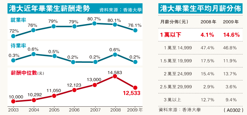 港大昨公布09年毕业生就业情况,在受访的约3100名本科毕业生中,不计算医生和牙医等“高薪族”,09年毕业生薪酬中位数为12,533元,较08年急跌14.1%,返回06年水平。另外,学生就业率只有76.1%,较08年下跌4个百分点,与04年水平相若。