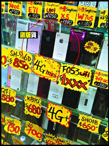 记者日前到位于旺角、有“水货手机特卖场”之称的先达广场视察,发现其中一间店铺所售卖的新款手机,与仍未正式抵港发售的苹果iPhone 4,外形上有90%相似,机背还印有苹果商标。
