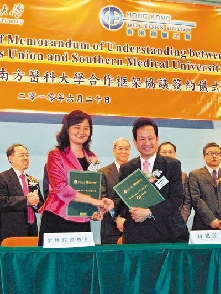杨超发昨代表香港西医工会,与南方医科大学副校长余艳红签署合作协议书;是项协议将于年底正式推行,只接受香港西医工会会员申请,目前约有20位港医表示有意参与计划。