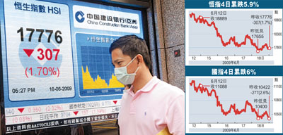中新网6月19日电 据香港《文汇报》报道,港股连续第4个交易日下跌,恒指18日刚开市便急挫,失守18000点大关后,瞬即落至全日最低位17655点,连17700点也守不住,午后跌幅虽一度收窄,但临收市沽压又再度重现,全日收报17776.6点,跌307.9点,成交额639亿元。