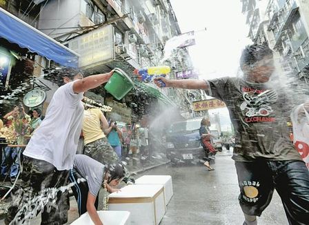 中新网4月12日电 据香港明报报道,那边厢的泰国曼谷因局势紧张而被迫取消一年一度的泼水节,这边厢有“香港小泰国”之称的九龙城就继续过节,希望为家乡拨走“衰气”,昨日近300人由打鼓岭道出发,沿启德道及龙岗道一带上演激烈的埋身水战,无论是参加者或路过市民都无一幸免。