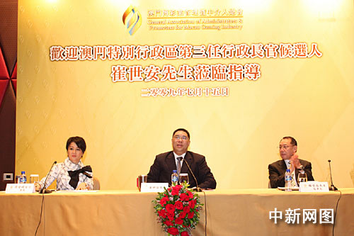 中新网7月16日电 第三任澳门特区行政长官候选人崔世安昨日与博彩管理暨中介人总会座谈。