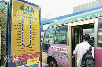 44A小巴行走屯门港铁站至上水广场,站头张贴的告示说明,屯门站服务时间为清晨5时至晚上12时,每天行走19小时,较运输署规定早1小时开车,迟1个半小时收车;上水站实际服务时间为清晨5时半至凌晨1时,较官方规定超出3.5个小时。