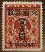 这枚红色印花邮票是清朝人用作缴交关税的三分税票,但国家邮政成立初期未有足够邮票使用,在税票盖上一元,当作邮票。