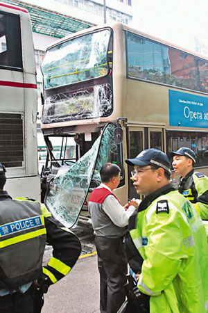 中新网12月31日电 据香港《文汇报》报道,香港油麻地发生两辆巴士相撞事件,一辆双层巴士在入站停车后,另一辆巴士尾随而至,却收刹不及撞向停下巴士,导致两车首尾损毁,两车车长及6名乘客受轻伤,送院敷治无大碍。