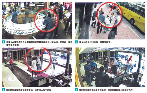 陈佑铭女儿陈怡透露,事发当日(22日)其父被郑姓导游要求在红磡JW Jewellery Outlet Limited珠宝店逗留至少2小时。由于珠宝店大门关上、楼底矮、人多又没座位,他感到局促,在店内逗留半小时后到店外透气,20分钟后郑导游要求他回到店内。陈怡说:“当时父亲表明自己身体不适,又有心脏病,导游反而抢白父亲是以病威胁,令老人家非常气愤。”陈佑铭于口角期间病发晕倒,送院后证实死亡。