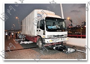 女骑士疑被密斗货车车轮辗至上下半身分离,头颅破裂,当场惨死。女乘客下半身也被车轮辗过,粉碎性骨折,送往山顶医院抢救,情况危殆。意外起因有待警方调查。