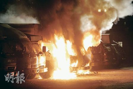 现场为何文田忠孝街56号的露天停车场,5辆被焚货车并排停泊,部分车辆的驾驶室烧剩支架。其中一辆载有约40罐石油气的货车右车头烧毁,幸货斗内的石油气未被波及,否则后果严重。