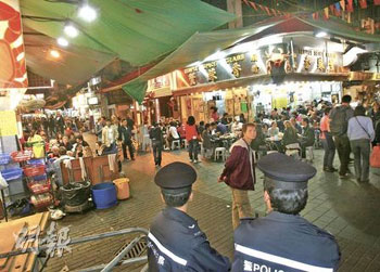 在庙街案发现场经营大牌档的珠姐说,早前警方曾提醒,一旦遇事,应监视楼梯口,她9日晚听到有人扔腐蚀弹后,便叫2名职员守住怀疑涉案大厦的铁闸,惜未发现可疑人,现场商户则如同平日演练般,熟手地报警、取水救人及监视有否疑人。