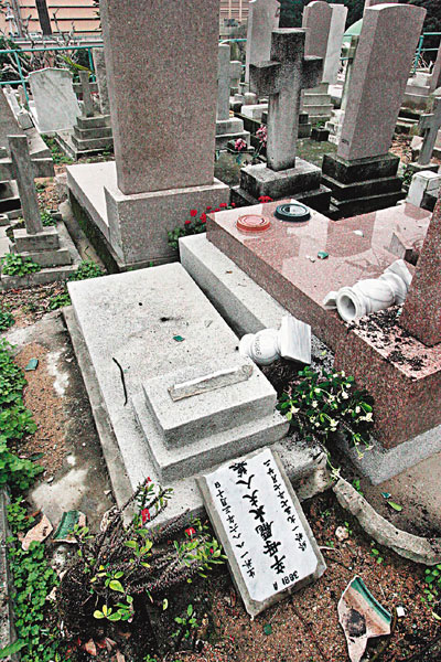 郑表示,他19日晨如常回坟场开工,于早上9时45分巡视期间,发现第3、5和6段内的墓地有多个坟墓被人蓄意破坏,其中有覆盖在墓地上的三合土被人凿至断开数块露出泥土,另有墓碑被推倒或断成两截,供插花的大理石、云石花瓶或花盆也被人砸烂,他于是报警。