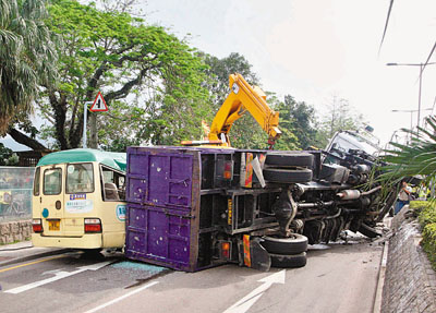 昨下午2时45分,1名李姓(34岁)男子驾驶1辆16吨重,车斗载有大量计算机零件废料的货车沿沙头角公路快线往粉岭方向行驶,及至近军地北村对开一个交通灯位前,司机报称脚掣失灵,遂将车扭向右边撞向路中石壆图掣停车辆,货车撞壆后却向左边翻侧,车头当即压中前面1辆正在停灯位的私家车车尾,而车斗则撞中另一辆由慢线驶至的小巴右边车身,车斗大量废计算机零料倒满一地。