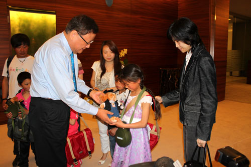 凤凰卫视董事局主席/行政总裁刘长乐把他们带进自己的办公室,让孩子们尽情玩耍,并且送上了书包、衣服、围巾、帽子、水壶、文具、玩具熊、巧克力等礼品,希望他们尽快走出灾难的阴影,和其他孩子一样快乐成长。活泼的江巴才仁还坐到了刘主席平时所坐的办公桌前,并迟迟不肯下来。刘主席让孩子们坐在平时接待贵宾的沙发上和他们聊天,鼓励他们长大以后可以到香港来上学,也可以做一名记者。