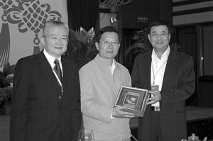 图:徐泽、廖泽云向强卫致送纪念品。(图片来源:澳门日报)