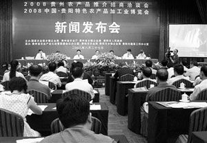 “2008中国•贵阳特色农业产品加工业博览会、2008贵州农产品面向粤港澳等地推介招商洽谈会新闻发布会”,27日上午在广州市广东大厦举行,贵州省农业厅副厅长吴承斌、贵阳市政府副秘书长张彪等出席。