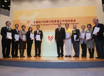 唐英年又说,为了贯彻特区政府牵头、全民参与的原则,由相关部门和民间人士组成的工作小组认真研究了所有基金申请,并经过香港特区支援四川地震灾区重建督导委员会的推荐,信托基金同意在首阶段批出共12项申请,批准的项目既有硬件设施,同时也突出了香港非特区政府组织所擅长的软件服务,涉及的资助总额超过8700万港元。