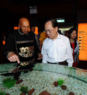 曾荫权还到了“金鱼宝典”一睹全球最大的黑狮头金鱼,他在金鱼愿望树上写上愿望,意指海洋公园全球第一。