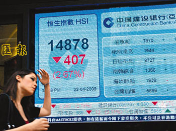 中新网4月23日电 据香港《文汇报》报道,港股经周二转势后,22日继续下跌,终跌破15000点。大市在上午曾一度上升,但午后内地上证综指急插水3%,拖累港股表现,淡友趁势发恶,午市大插400点的颓势,相信吓怕不少散户,尤其下午开市首15分钟便挫近260点。恒指收报14878点,跌407点,跌幅2.7%。