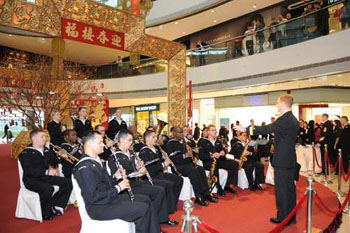 中新网1月31日电 向来只参加公益演出的美国军舰“蓝岭号”第七舰队21人乐队,30日在香港某商场首次公开演出,迎接中国农历新年。